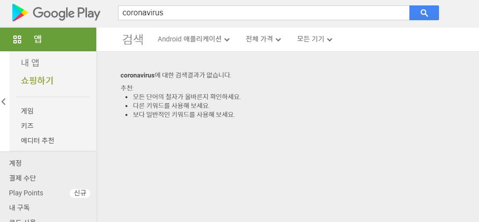 Play 스토어 앱 또는 play.google.com에서 "coronavirus"또는 "COVID-19"를 검색하면 Android 앱 및 게임에 대한 "결과를 찾을 수 없음"메시지가 표시됩니다.
