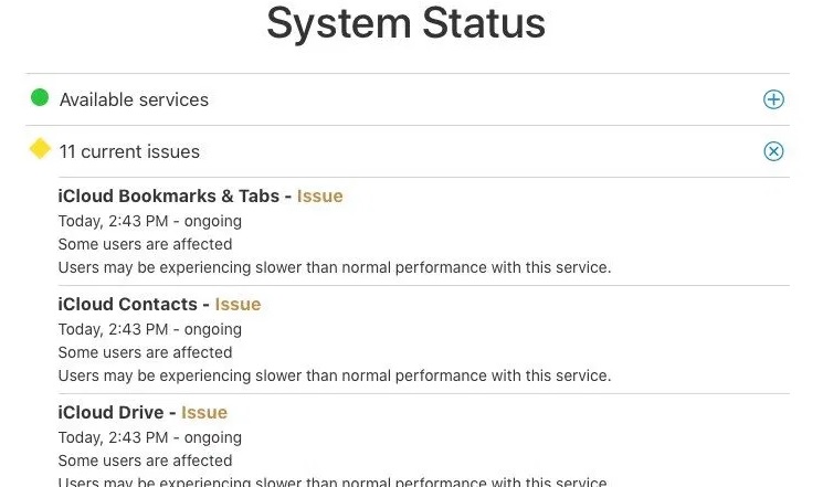 Apple 의 시스템 상태 페이지에 따르면 일부 사용자는 "정상 성능보다 느려질 수 있습니다" 라고 알려줍니다.
