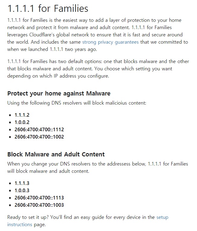 1.1.1.1에는 두 가지 기본 옵션이 있습니다. 하나는 맬웨어를 차단하고 다른 하나는 악성 프로그램 및 성인 콘텐츠를 차단합니다.