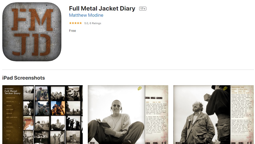 FULL METAL JACKET DIARY (FMJD) has been called an "appumentary" by Entertainment Weekly, “something Stanley Kubrick would be proud of" by Wired Magazine, and named "iPad App of the Week” by Gizmodo. It was selected as one of the "Best Book Apps of 2