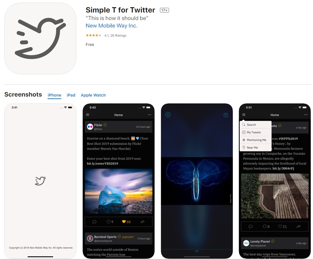 This is a third party twitter client based on twitter's public APIs, with: 1) Clear & simple layout, optimized for all sizes, all interface orientations on support devices; 2) Significantly smooth scrolling performance; 3) Apple Watch support. Key featu