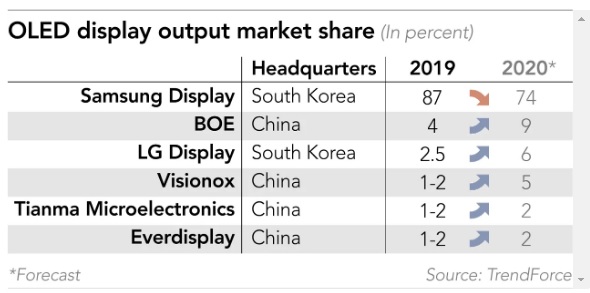 TrendForce에 따르면 2020년에 삼성은 OLED 디스플레이 시장의 74%를 차지할 것으로 예상되며, 중국의 BOE 기술은 9%의 시장 점유율을 가질 것으로 예상합니다.