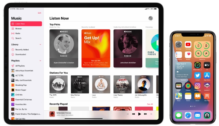 Podcast 앱에서 설정 한 패턴에 따라 Music의 새로운 홈 탭을 Listen Now라고합니다. 이 화면은 청취 습관에 따라 여러 가지 추천을 제공하므로 최소한의 브라우징으로 음악을 빠르게 즐길 수있는 새로운 공간을 제공합니다. 이전 버전의 음악에서 찾은 For You 탭을 대체합니다.