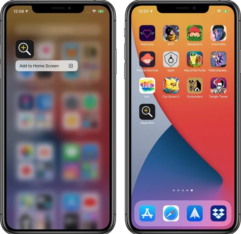 Magnifier 앱을 자주 사용하는 사용자의 경우, 앱 라이브러리에 접속해 Magnifier를 검색한 다음, 앱 페이지 중 하나로 끌어다 놓거나 "Add to Home Screen"을 길게 눌러서 Magnifier 기능을 활성화하는 앱 아이콘을 홈 화면에 추가할 수 있습니다.
