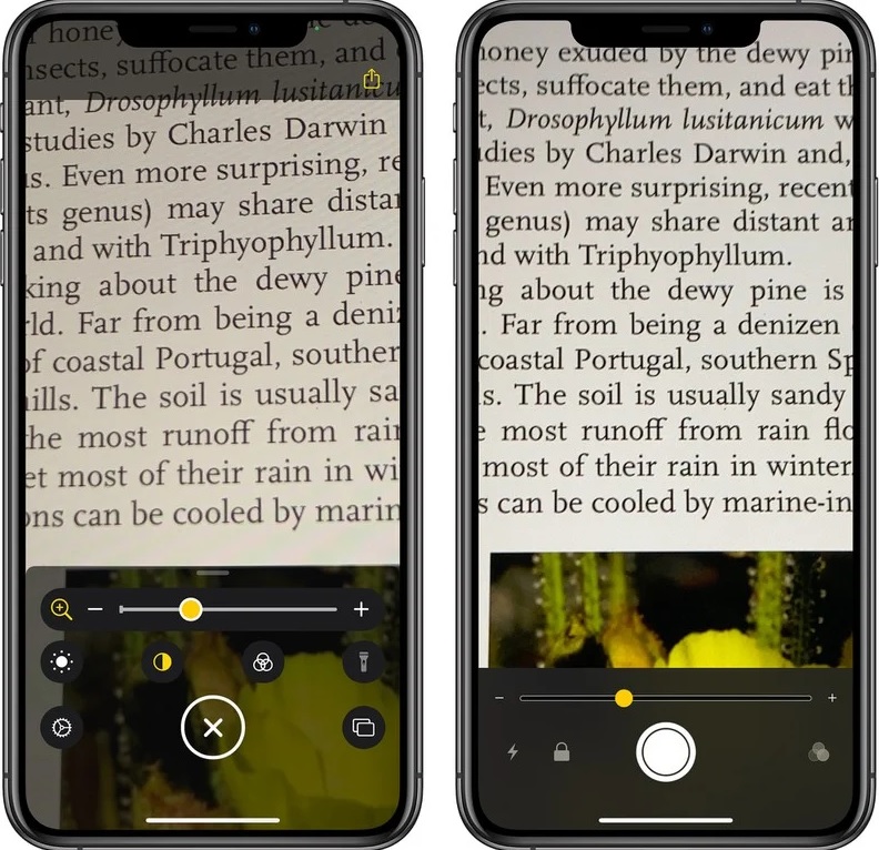 왼쪽 iOS 14 Magnifier 인터페이스, 오른쪽 iOS 13 Magnifier 인터페이스.