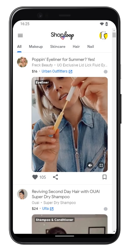 Shoploop은 모바일 전용 웹 앱으로, 수직 스크롤 인터페이스는 제품과 함께 크리에이터와 리뷰어의 수직 동영상을 보여줍니다.