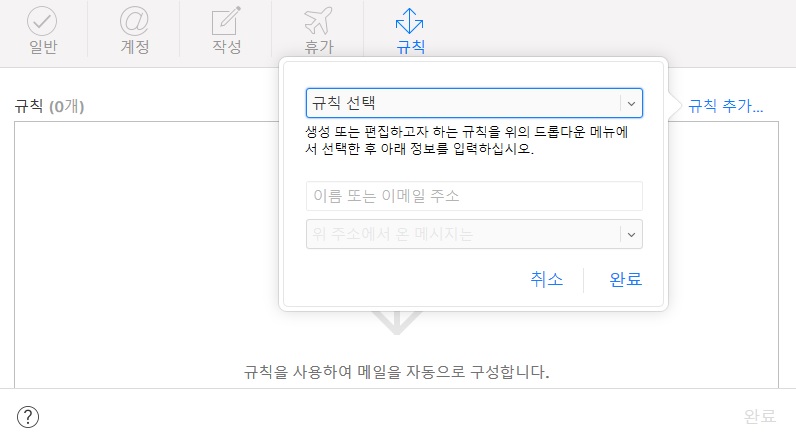 가장 간편하게 설정하는 방법은 규칙을 쓰레기통으로 이동을 선택한 후에 쓰레기 메일을 보내는 사람의 이름이나 email 주소를 입력해 주는 겁니다.
