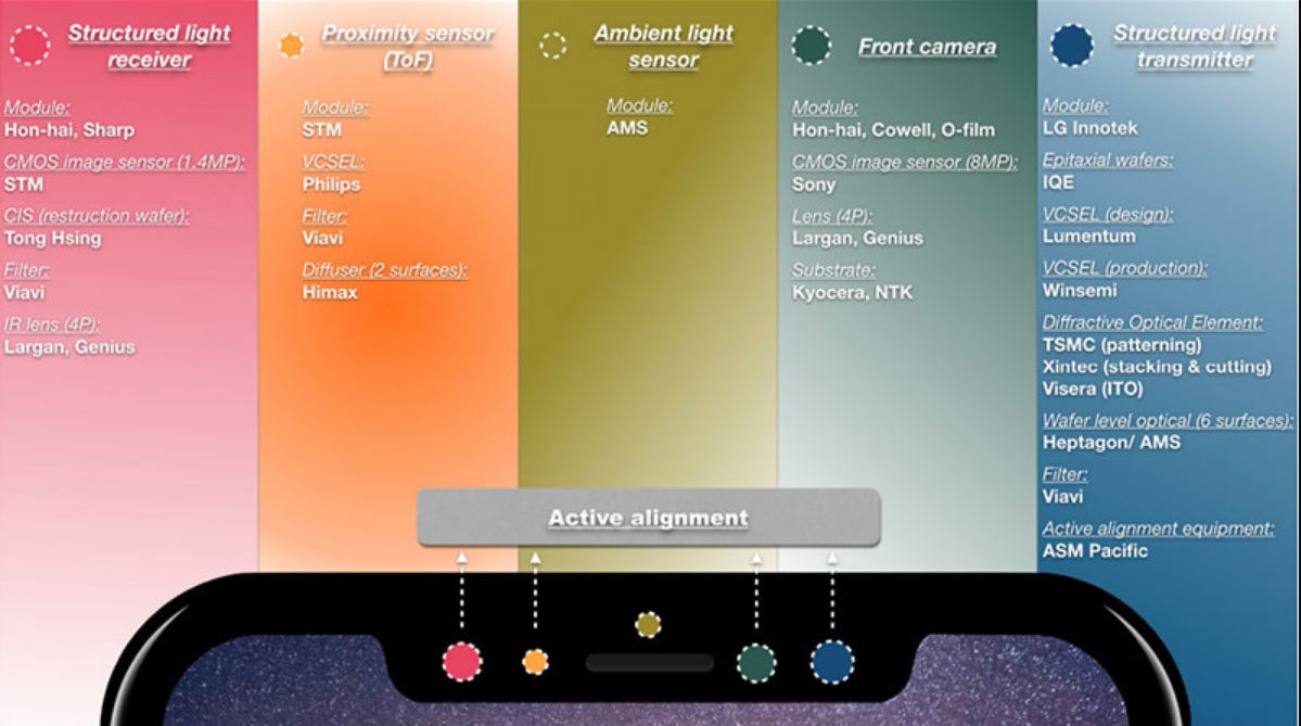 애플의 이 시스템은 4가지 주요 구성 요소인 구조적 광송신기, 구조적 광수신기, 전면 카메라와 TOF(time of flight) / 근접 시간 센서에 의존합니다.