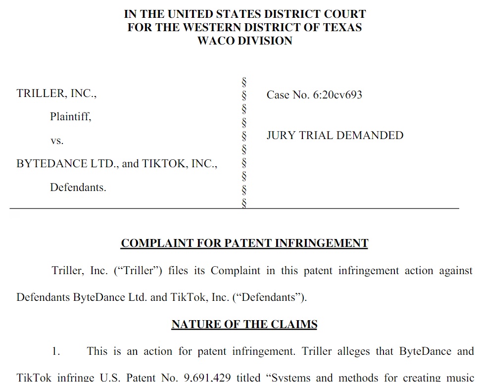 텍사스 서부지법에 제출된 이 소송은 틱톡이 트릴러의 미국 특허 번호 9691429를 침해하고 있다고 주장하고 있습니다. 이 특허는 "오디오 트랙과 싱크로나이즈드 뮤직 비디오를 만드는 시스템과 방법"을 다룹니다.