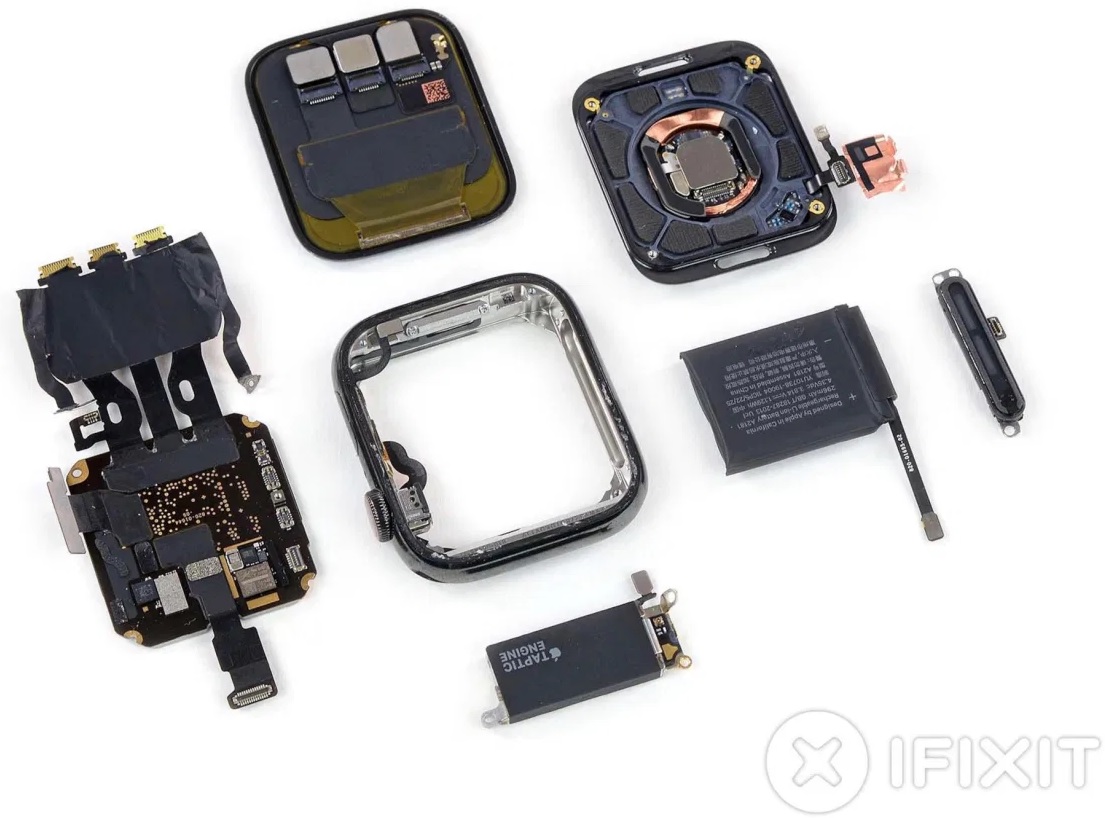 배터리의 디자인을 보여주는 Apple Watch Series 5의 분해