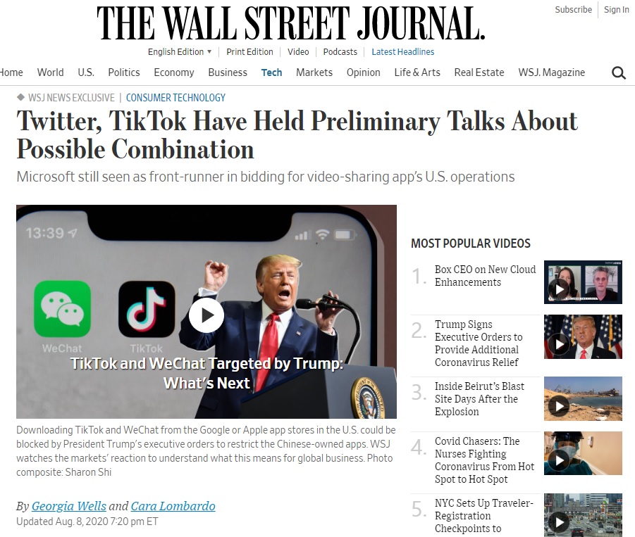 도널드 트럼프 대통령은 2020년 8월 7ㅇ;ㄹ 금요일에 중국 기술 회사와의 미국 거래를 금지하는 2개의 행정 명령에 서명했으며, 미국 회사가 인수하지 않으면 틱톡을 금지하겠다는 의지를 표명했습니다.