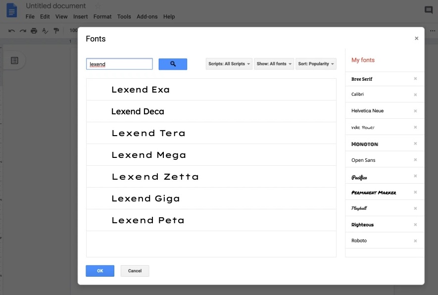 - 그런 다음 Lexend를 검색하고 글꼴을 선택하여 저장된 글꼴에 추가합니다. 이제 "내 글꼴"목록과 도구 모음의 글꼴 메뉴에 나타납니다.
