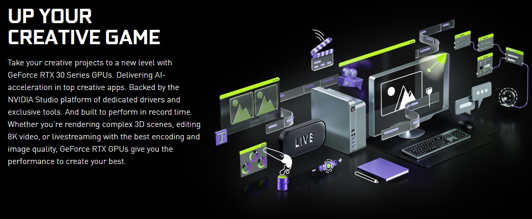 GeForce RTX 30 시리즈 GPU로 창의적인 프로젝트를 새로운 차원으로 끌어 올리십시오. 최고의 크리에이티브 앱에서 AI 가속화를 제공합니다. 전용 드라이버와 전용 도구의 NVIDIA Studio 플랫폼이 지원합니다. 그리고 기록적인 시간에 수행 할 수 있도록 제작되었습니다. 복잡한 3D 장면을 렌더링하든, 8K 비디오를 편집하든, 최고의 인코딩과 이미지 품질로 라이브 스트리밍을하든 GeForce RTX GPU는 최고의 성능을 제공합니다.