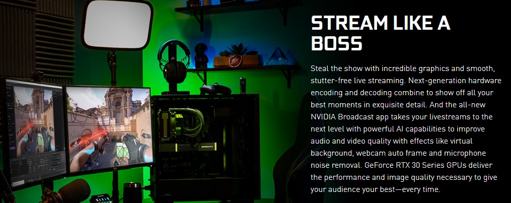 놀라운 그래픽과 부드럽고 끊김없는 라이브 스트리밍으로 쇼를 훔쳐보세요. 차세대 하드웨어 인코딩 및 디코딩이 결합되어 절묘한 디테일로 최고의 순간을 모두 보여줍니다. 그리고 완전히 새로운 NVIDIA Broadcast 앱은 가상 배경, 웹캠 자동 프레임 및 마이크 소음 제거와 같은 효과로 오디오 및 비디오 품질을 향상시키는 강력한 AI 기능을 통해 라이브 스트림을 한 단계 끌어 올립니다. GeForce RTX 30 시리즈 GPU는 청중에게 항상 최고의 성능을 제공하는 데 필요한 성능과 이미지 품질을 제공합니다.