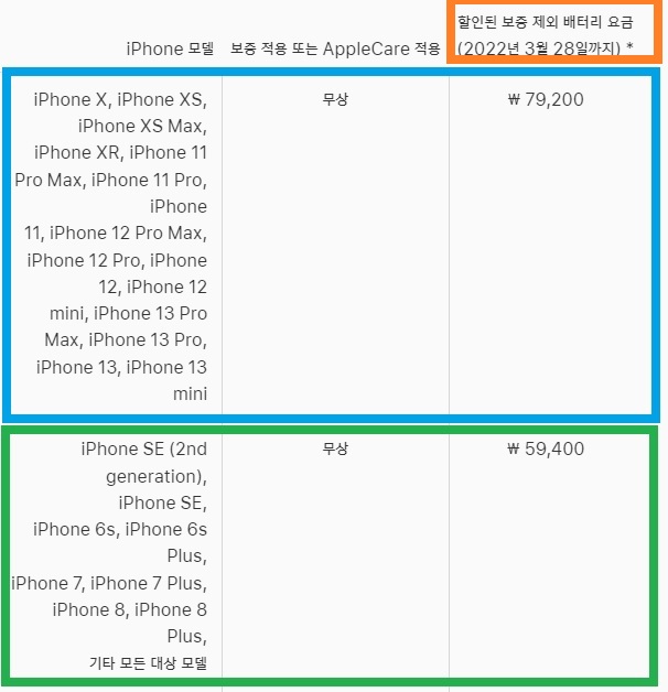 애플은은 2022년 3월 28일까지 아이폰을 사용하는 대한민국 고객에게 보증 제외 서비스에 대한 할인을 제공한다고 합니다.