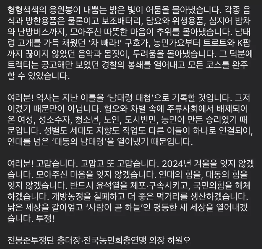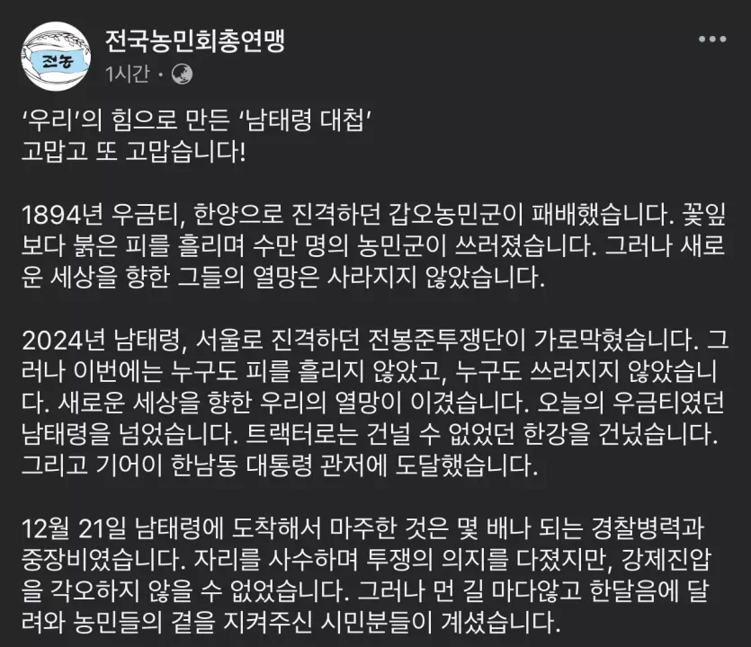 넋두리 전국농민회총연맹 감사 인사 - 우리의 힘으로 만든 남태평 대첩 by 빈폴청바지 2024. 12. 23. 728x90 728x90 공유하기 게시글 관리 생산적 활동 (A Vital Activity) 관련글 12.3 내란선동 시국선언 123명 교수 명단 (내란동조 또는 내란선전) * 드라마 시나리오 12월 14일 여의도 촛불집회와 광화문 탄핵반대집회의 차이 국짐 박상수대변인의 나경원 저격