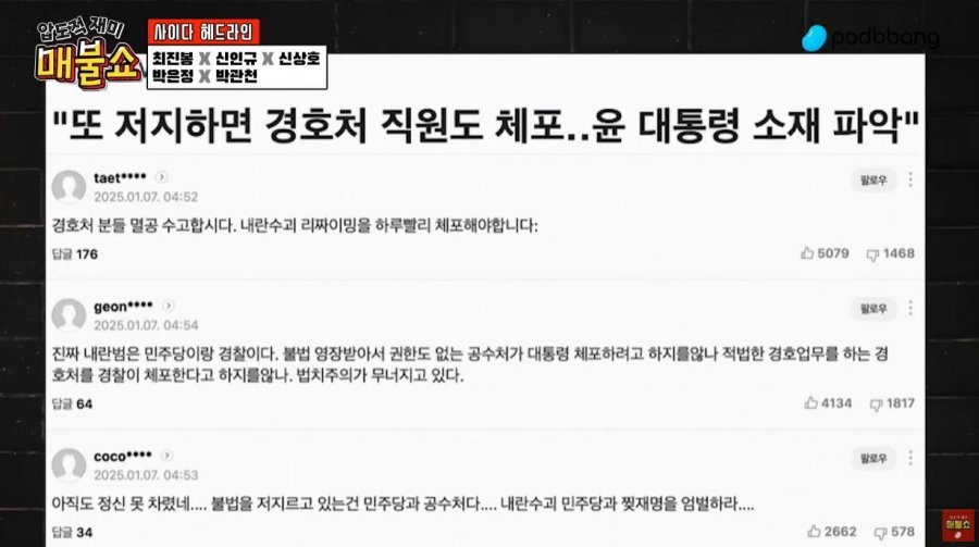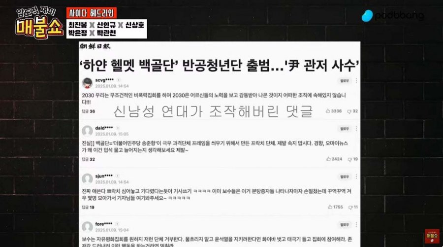 넋두리 매불쇼 - 신남성연대 배인규가 네이버 댓글 조작팀 운영 by 빈폴청바지 2025. 1. 10. 728x90 그동안 네이버가 방치하고 댓글 조작팀이 댓글 조작하고 아주 개판이었네요 드루킹이 네이버 댓글 조작하다가 업무방해로 감옥갔는데... 728x90 공유하기 게시글 관리 생산적 활동 (A Vital Activity) 관련글 고교 무상교육 법안 최대행이 거부건 행사 (2025년 1월 14일) 미국의 국수주의로 인해 전세계는 난리가 날 것 백골단과 대치 중인 최민희 민주당 내란선전 혐의 유투버 고발