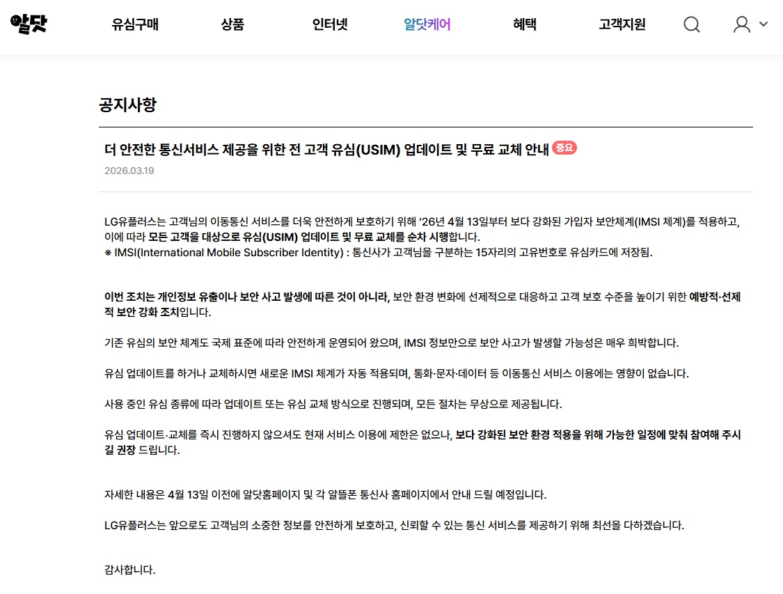 LG유플러스는 고객님의 이동통신 서비스를 더욱 안전하게 보호하기 위해 ‘26년 4월 13일부터 보다 강화된 가입자 보안체계(IMSI 체계)를 적용하고,