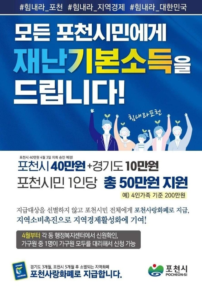 이재명 경기도 재난기본소득 10만원 + 18개 시군 추가, 포천 1인당 50만원 최고