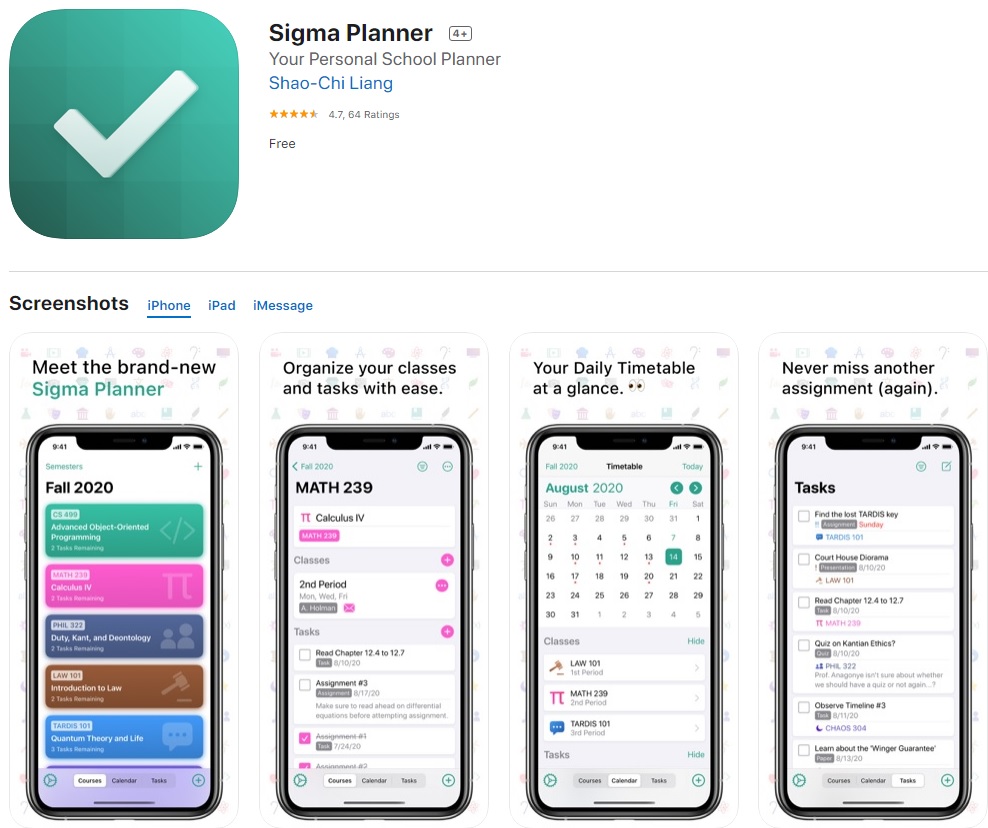 Sigma Planner is the perfect companion app for your academics that will help you track your classes and tasks with ease. With Sigma planner, you will never need to carry your school planner anymore; simply pull out your iPhone or iPad, and everything wi