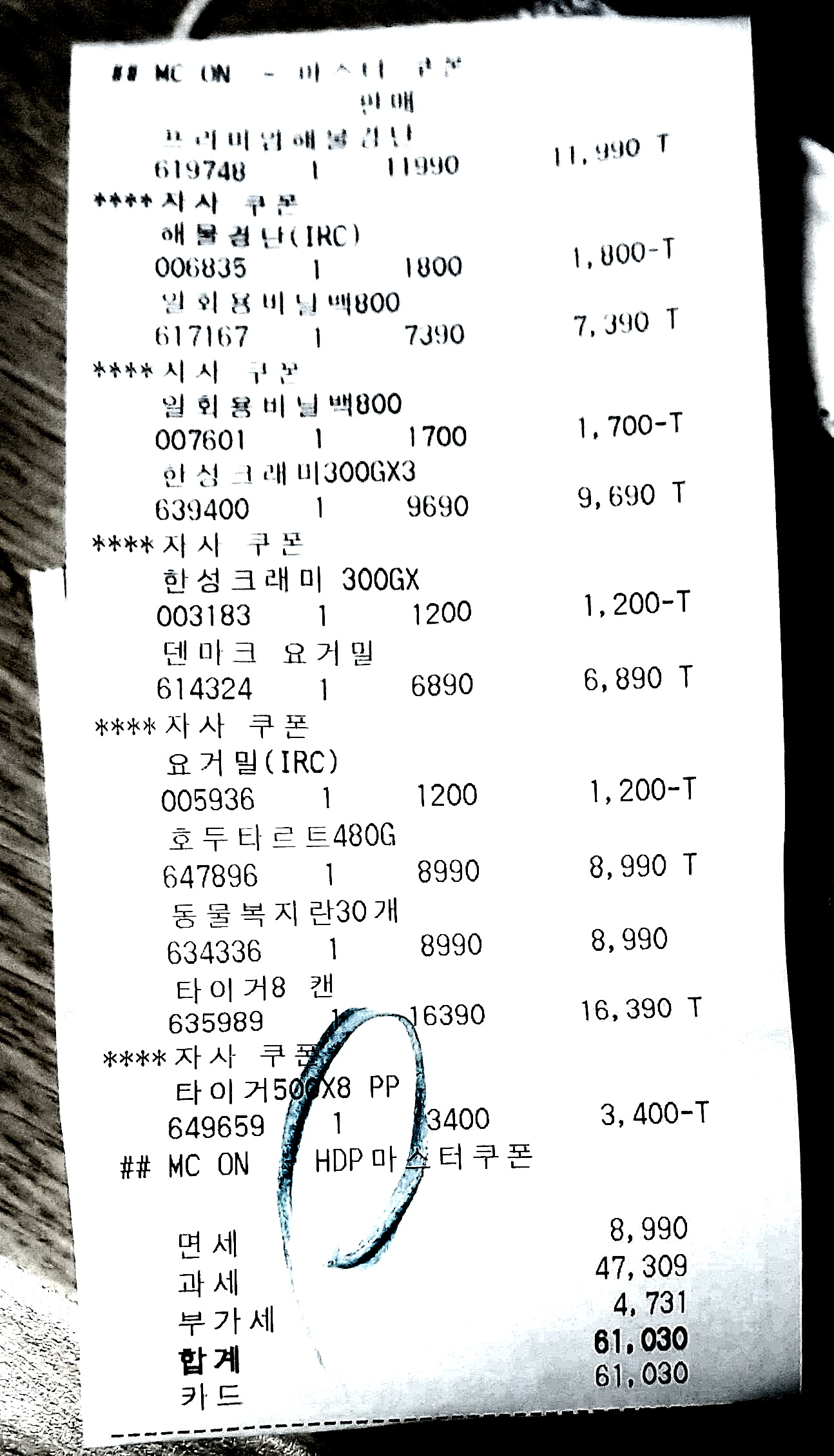 그외에 타르트 빵하고, 고구마 요거밀, 한성크래미, 해물경단, 타이거 캔맥주 등을 구입했구요.