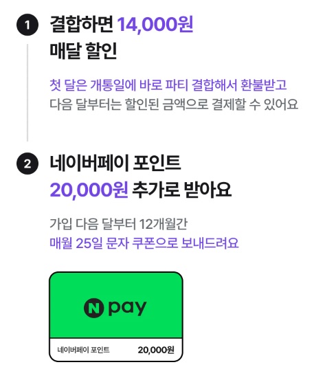 59,000원 요금제에서 파티 맺으면 14,000원 할인을 받고 추가로 네이버페이 포인트를 20,000원을 받기 때문에 실질적으로는 25,000원에 사용 하는 효과를 12개월간 봅니다.